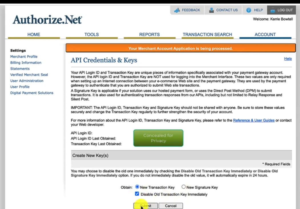 And then we go back into Authorize.Net. Now in Authorize.Net, they actually hide the keys. So what we need to do is obtain a new transaction key because the one that I created before has been hidden now. I'm gonna need to disable the old one immediately.