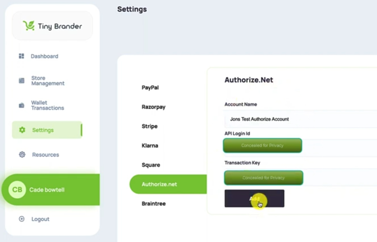 So I hope that's helped with the integration of an Authorize.Net merchant account. If you have any questions or concerns reach out to support@tinybrander.com. Thanks a lot.