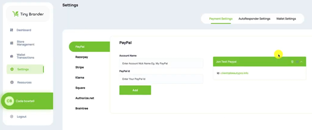 So here we are in the Tiny Brander account, you want to go down to Settings right down here on the left, and make sure you're in Payment Settings up here in the centre.