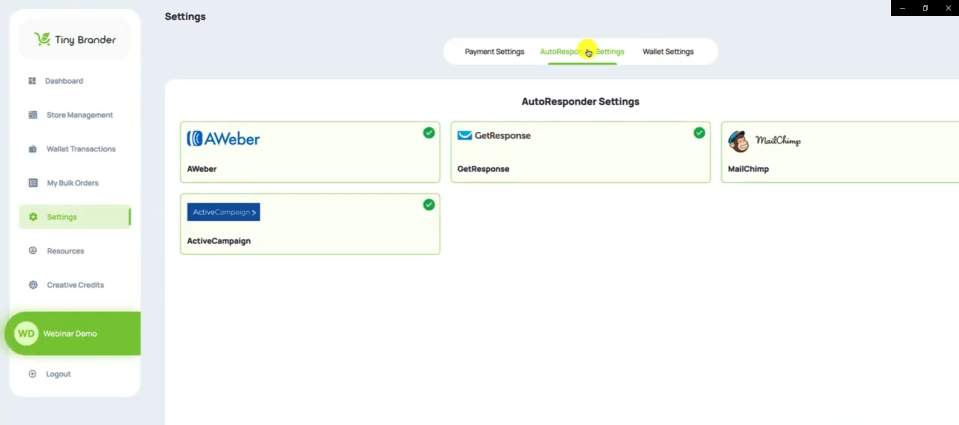 Okay, so here we are in Tiny Brander and the first thing you want to do is check that your MailChimp AutoResponder is integrated properly with Tiny Brander. And the way you do this is go down to settings…