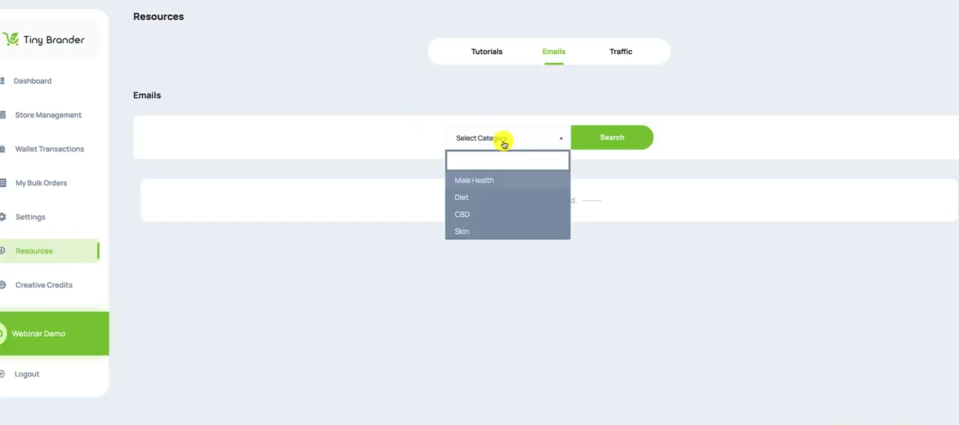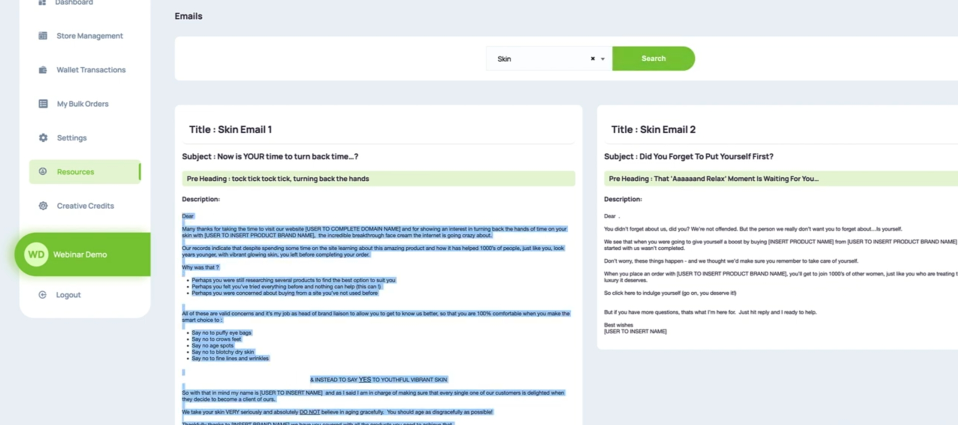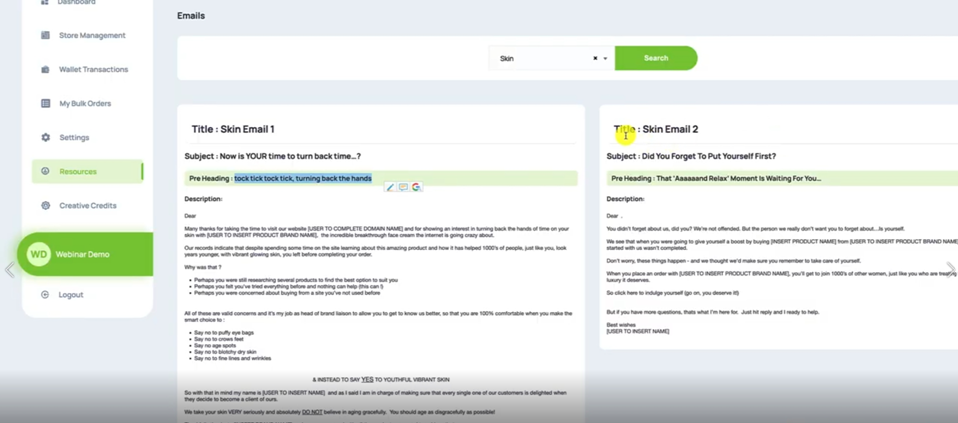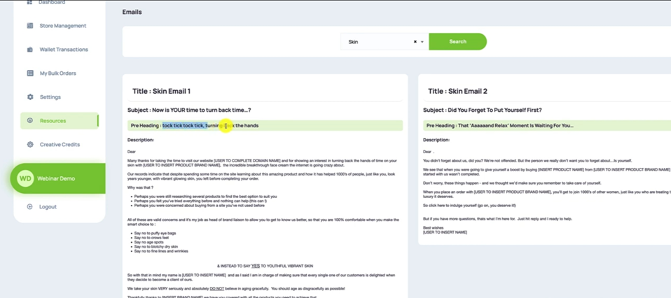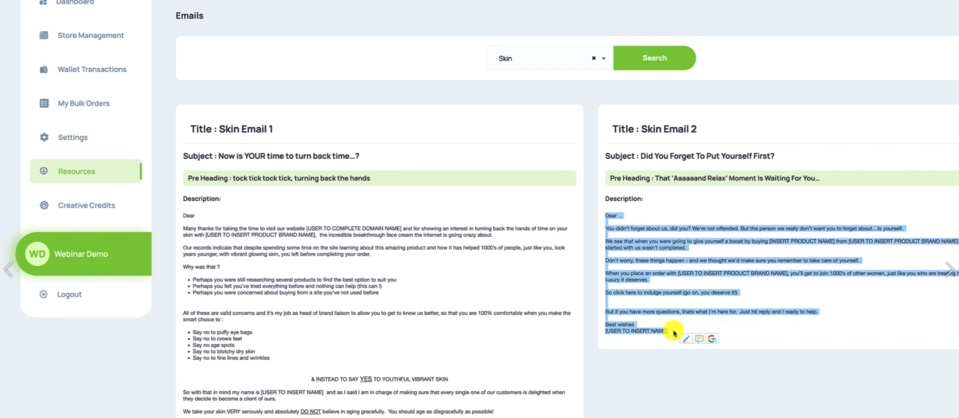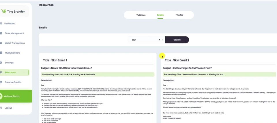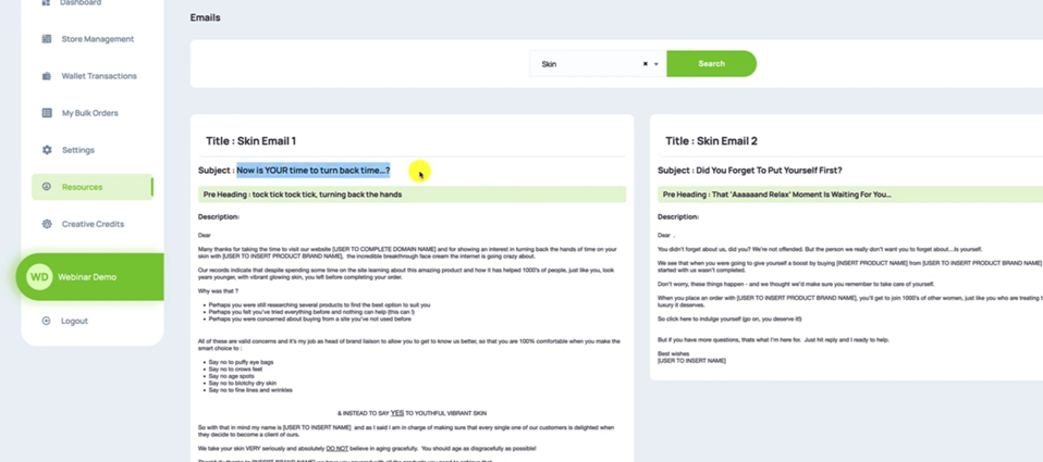 You want to search for the category of Emails that you want to send the AutoResponders in. So it's going to be Skin on this particular occasion, I'm going to hit Search. And that will bring up all of the emails that we have, we actually have seven there for the Skin niche.