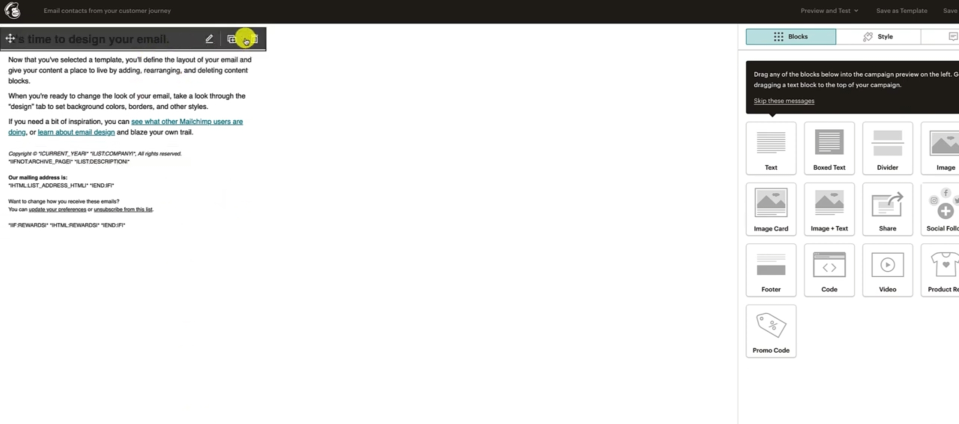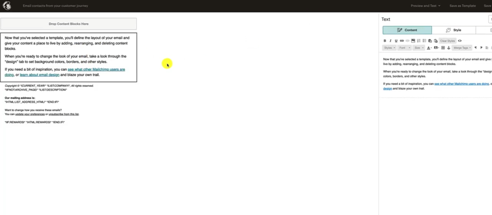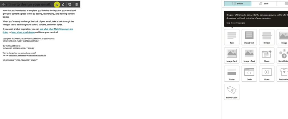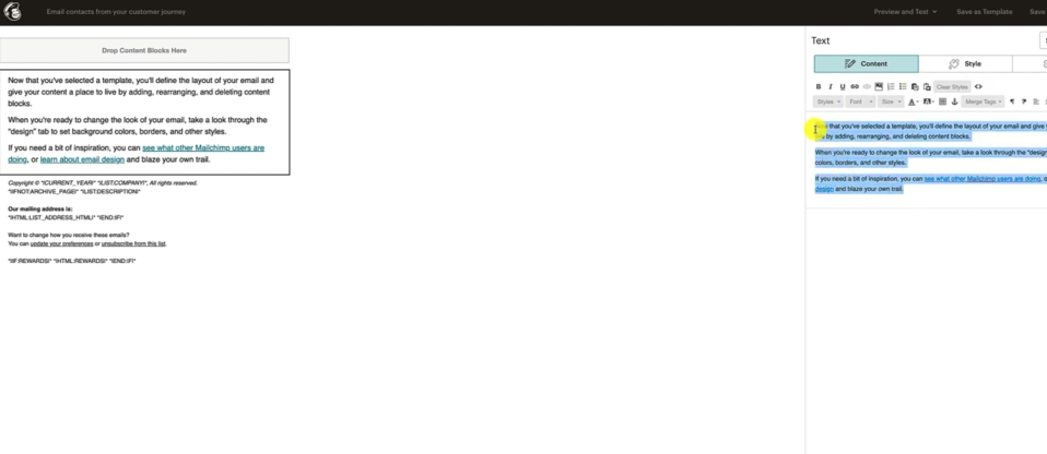 Go back to MailChimp. And when you highlight the text here, it gives you the editing table on the right hand side it's a little confusing.
