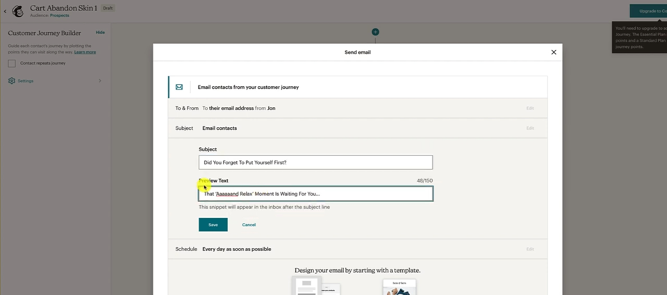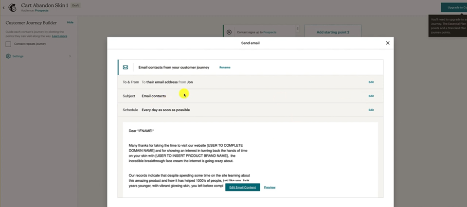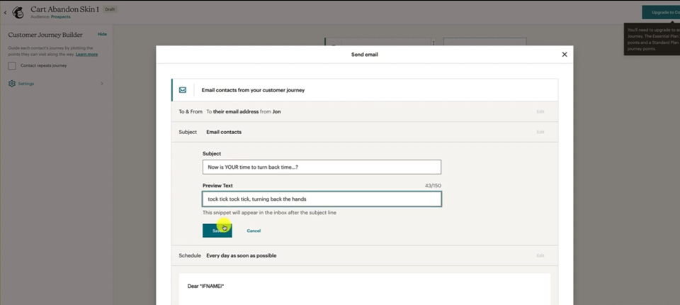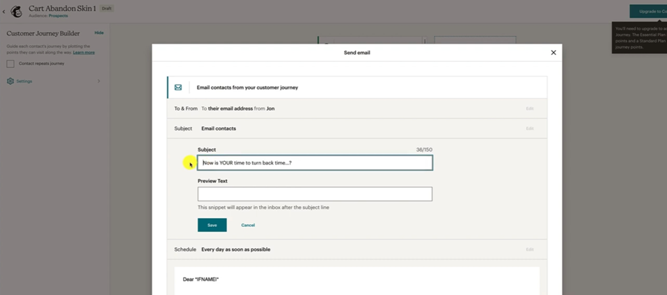 Remember to put in your Merge Tags so it's gonna be the First Name. Everything else looks good, remember to edit up this to suit your store, suit your brand, suit your product. And then we can just hit Save and Close and Save and Return to Journey and then we can have a look at the Journey overview. Okay.