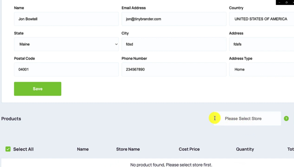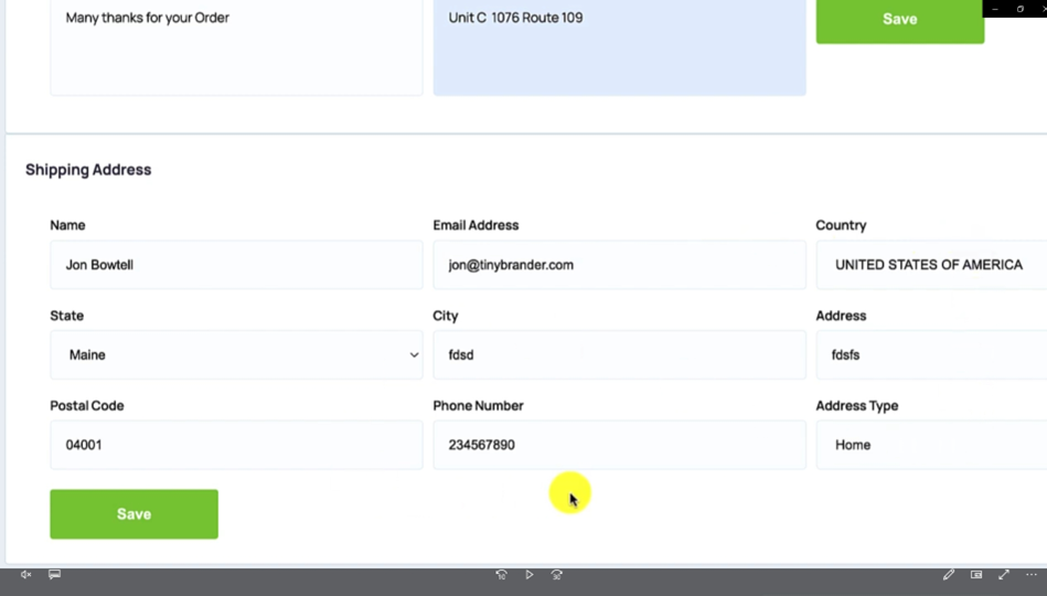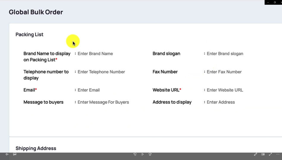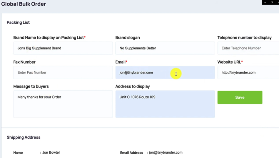 And any address that you want to display in there. So you can just hit save, oh, I have to have that website URL and so I would just put tinybrander.com Oops tinybrander.com and then we hit Save Okay, now that we have that customised packing list in there, now. Let me add the shipping address of where you want this bulk order to be shipped to. So make sure you have all the details in there correct because this will be where we ship it to.